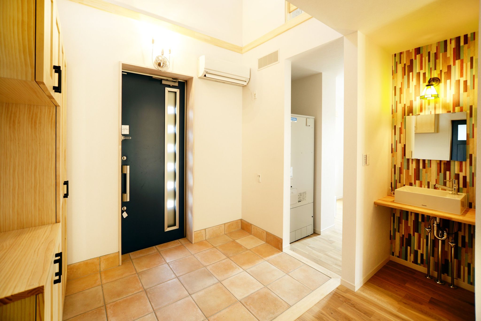 靴着脱用のイスと上がり框の高さ半分程度の式台(将来的に設置)